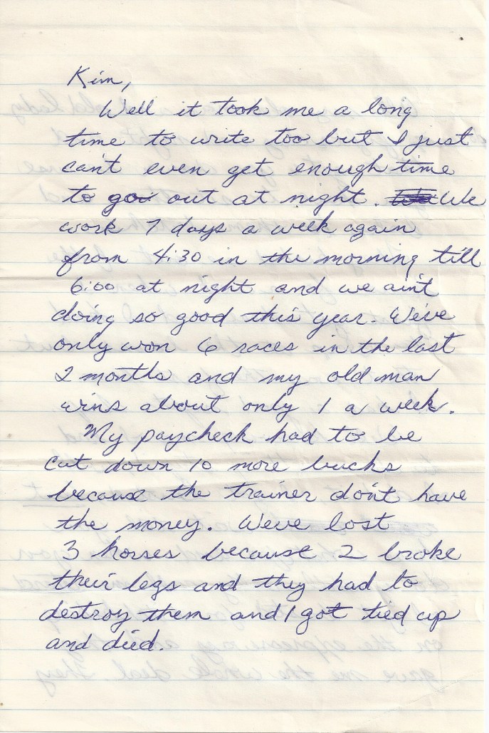 I pursed my lips as I thought about what he had just said. “You might be right. I just might write her a letter,” I answered as I sat down. The rest of the day was filled with the usual work. Hot horses coming in from the track to take care of and cleaning stalls. You’d be amazed how much a stable of horses can produce in a day. Huge mounds of dirty straw littered the alleyway at the end of each barn to be picked up by a truck later around noon.