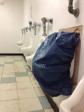 The Mayor and I stood quiet while relieving ourselves keeping the year-old broken urinal between us. Normally we abide to the strict rulings of the ‘Urinal Code of Ethics’ which dictates no man is ever to gaze at, look upon, or worse, speak to another man while finishing the dribble and subsequent shake-off. I couldn’t help break the law as I tilted my head looking slightly to my left and downward below the blue tarp covered veteran latrine labeled ‘Out of Order’. We had earlier in the year suspected the need for labeling the obvious was to alert those who took it upon themselves to moisten the plastic unknowing of the need of repair. We calculated it would take somewhere between 5 and 7 Bud Light drafts from the lower bar to impede such judgement and both agreed a saved splash-back was well worth the expense.